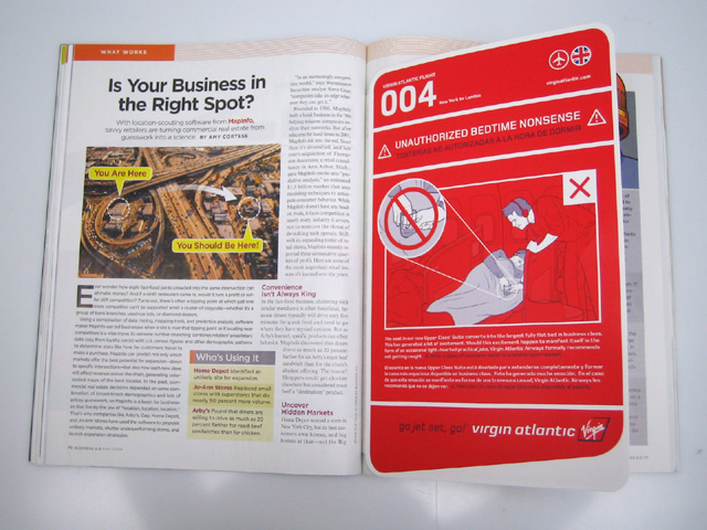 Produced and managed six versions of Virgin Atlantic “seat back card” insert totaling 37,000,000 pieces. Inserts ran over a 6 month period in Fortune, Business 2.0, Harvard Business Review, Fast Company and The Economist.